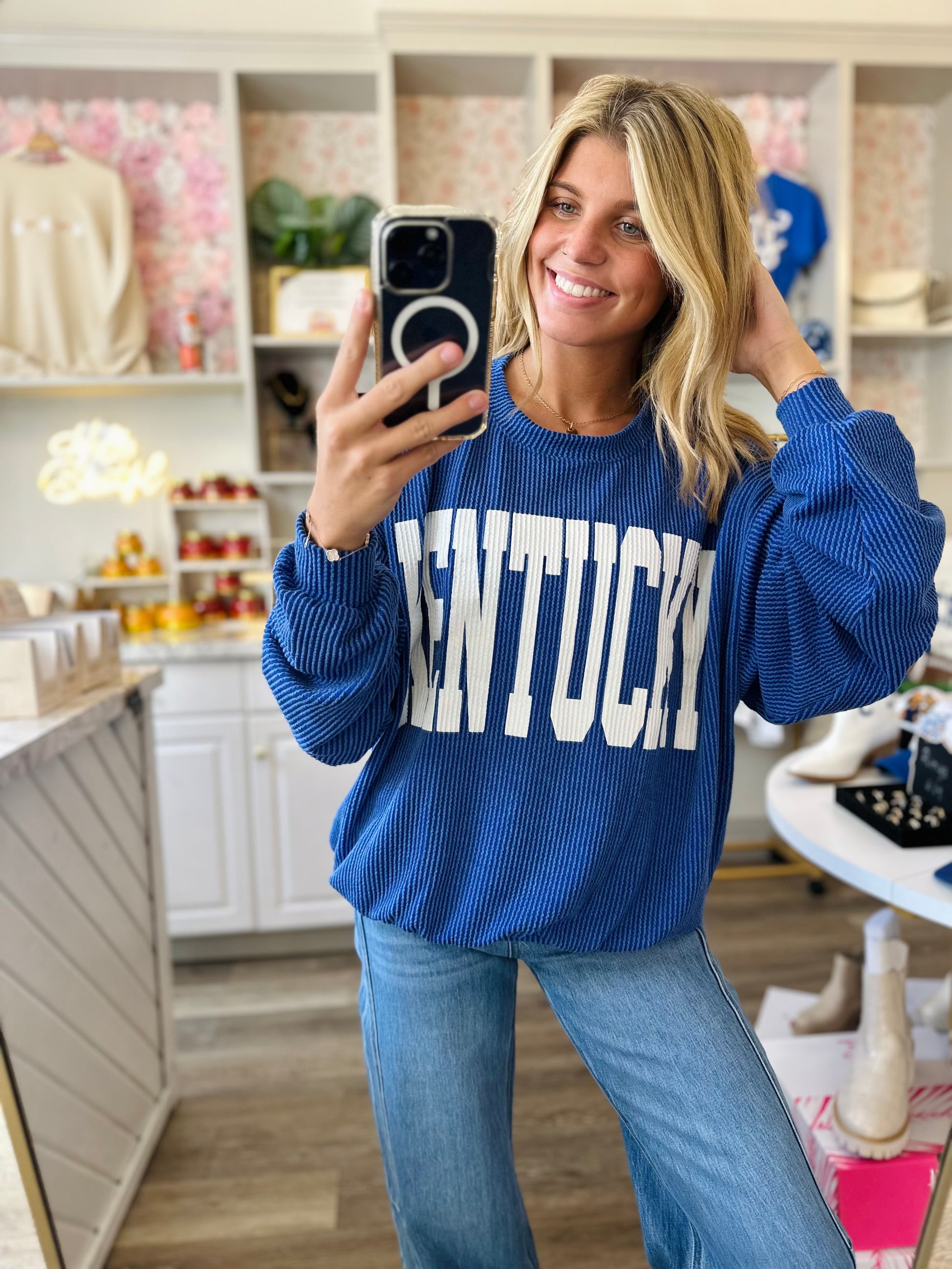 Crewneck, oversized, drop shoulder, corded royal blue graphic Kentucky sweatshirt.