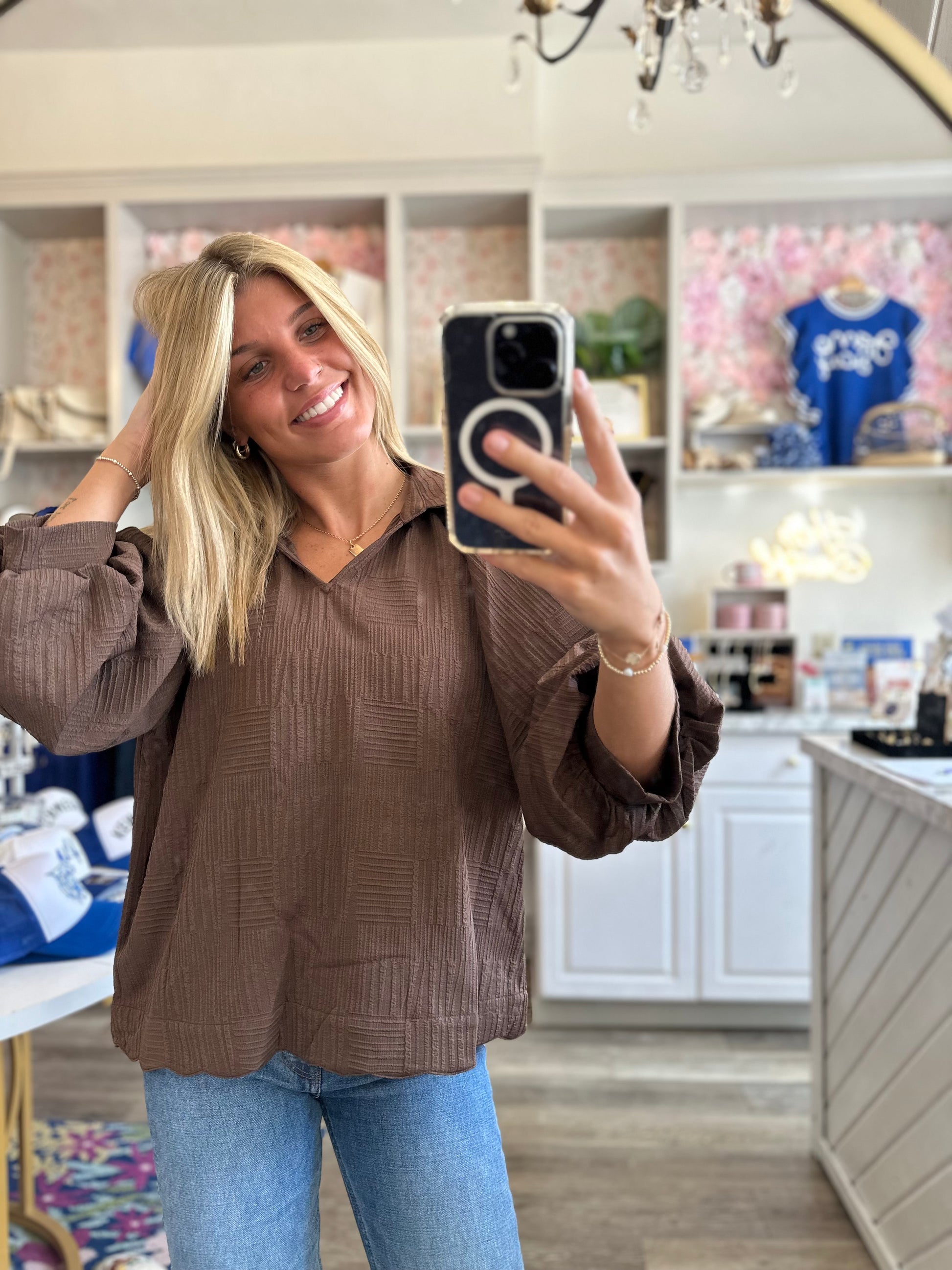 3/4 sleeve dark brown cocoa too with Vneck and collar, perfect for work, date night, brunch, or everyday.