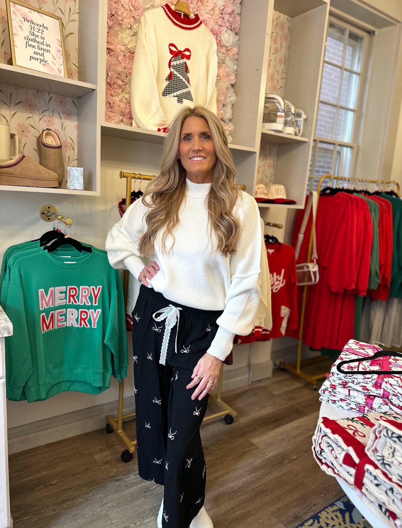Embroidered linen pull on pants in black with white bow detail. Lace drawstring, pockets, wide leg. 55% linen, 45% cotton.
