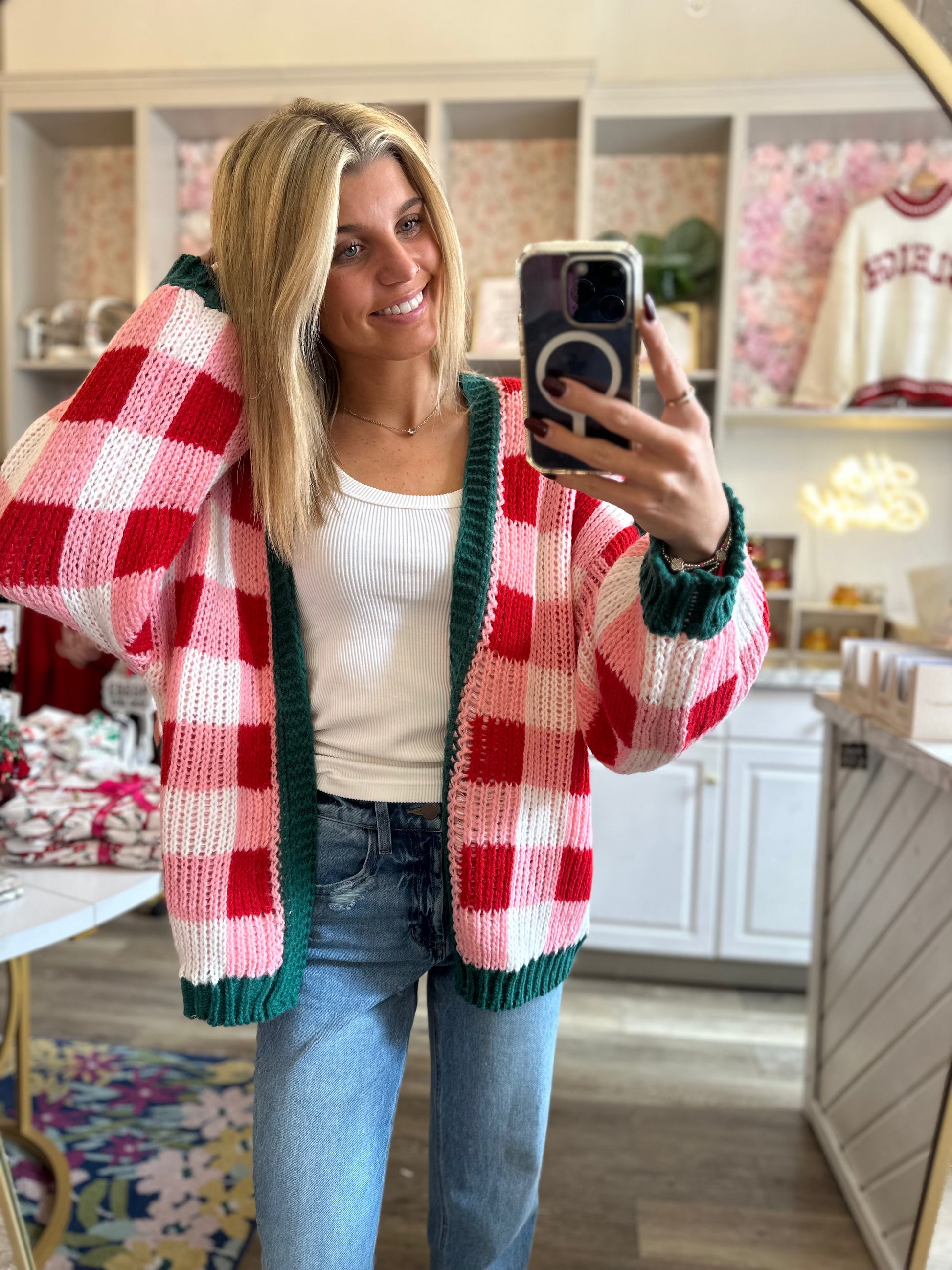 Open front Christmas sweater cardigan in red and pink checkered pattern with green bow detail.