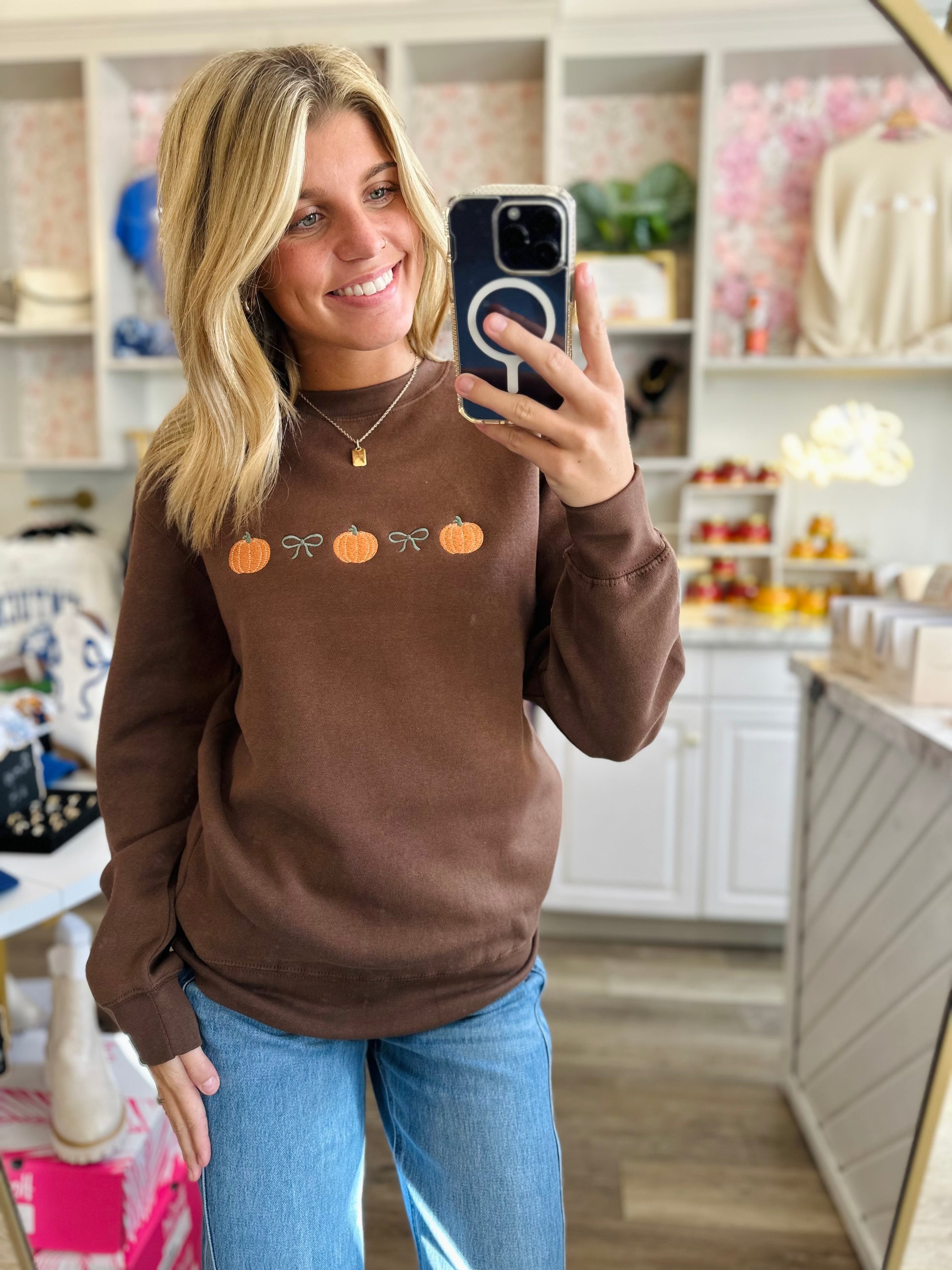 Dark brown crew neck sweatshirt with embroidered pumpkins and bows in orange and green. Perfect for fall and cool weather!