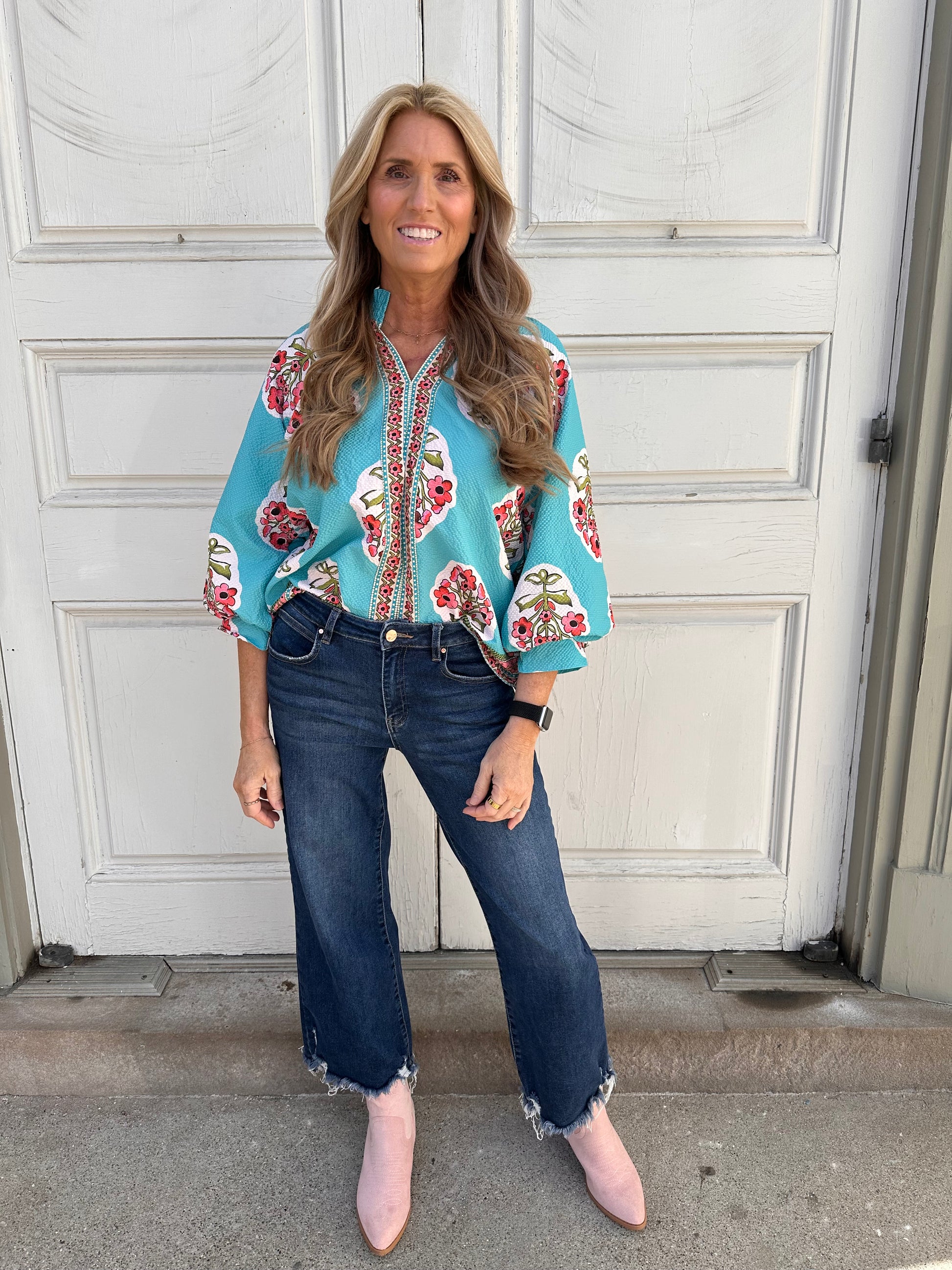 A aqua mint with a split V-neck top with border print at placket & bottom
