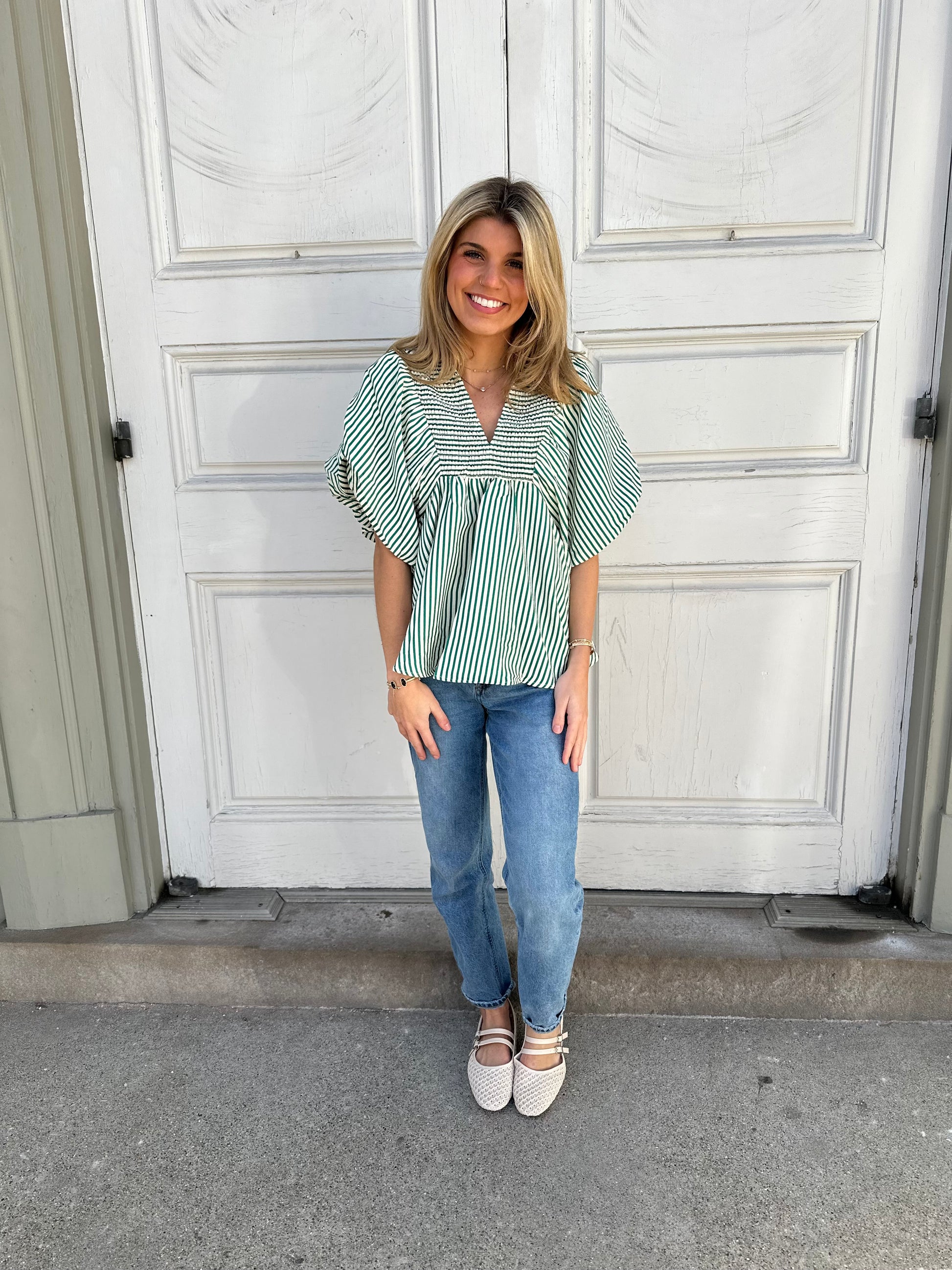Green top with white strips and puff sleeves and V-neck